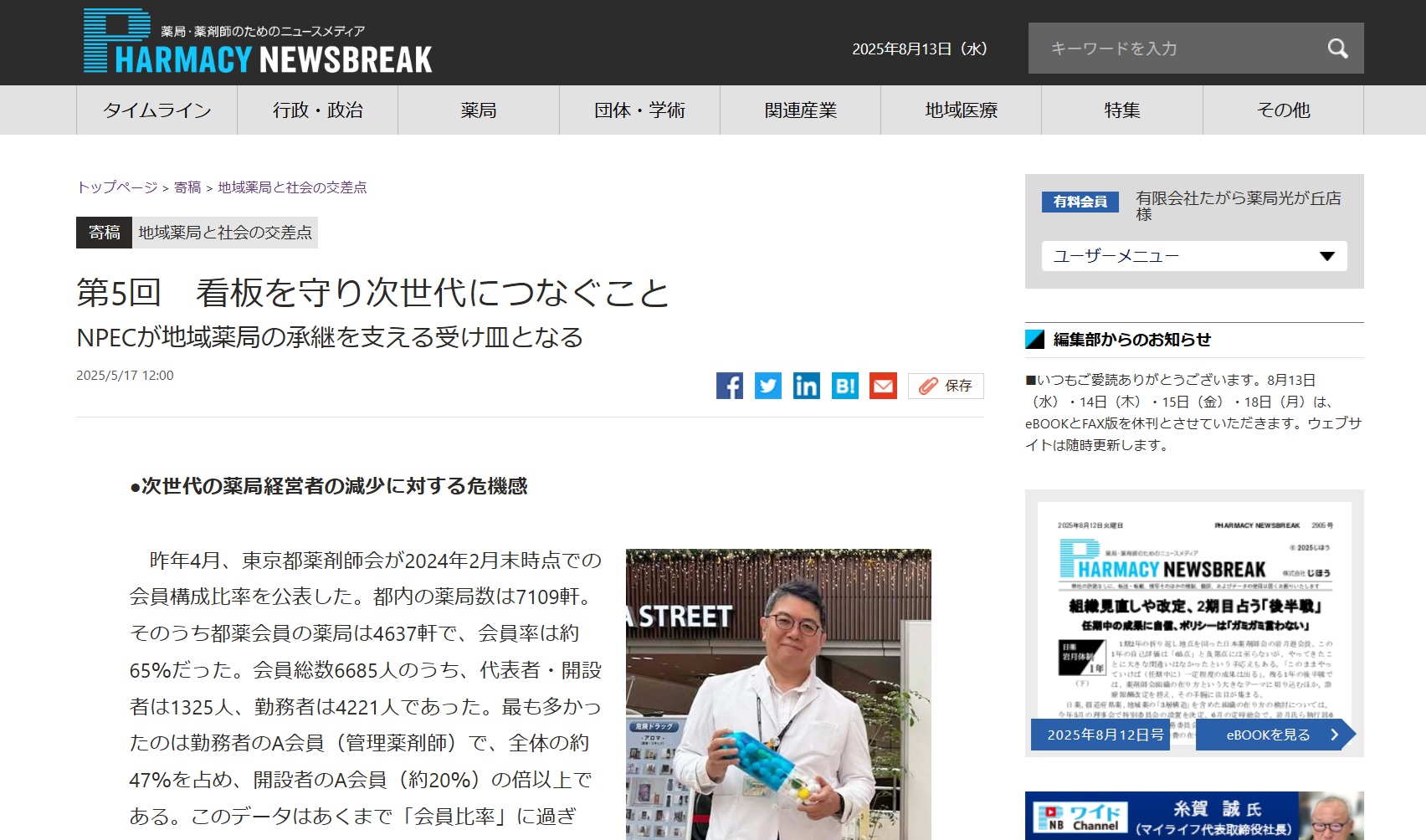 この連載は、次世代薬局経営者コンソーシアム(NPEC)の発起人たちによる寄稿です。今回は当薬局の代表によるはじめての寄稿です。