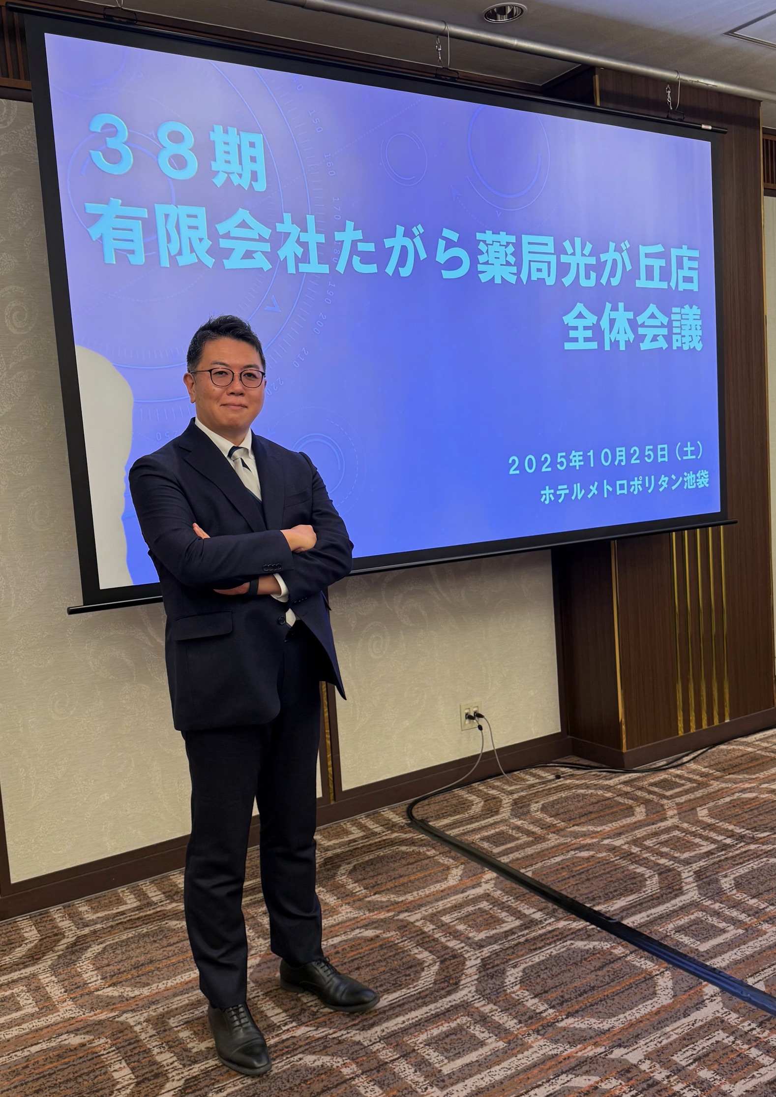 有限会社たがら薬局光が丘店の全体会議を令和7年10月25日(土)ホテルメトロポリタン池袋で開催しました。38期の経営方針の発表に加え、全5薬局の薬局長より各薬局の取り組みを発表しました。